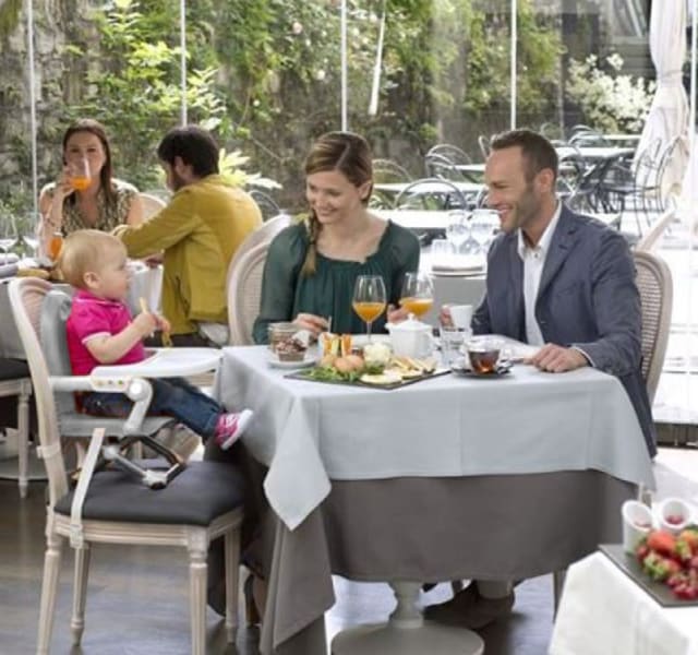 - Thanks to the practical fastening straps to the chair and the child's restraint belts, eating all together will be easier and safer.