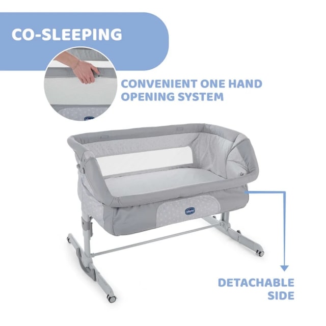 Chicco Next2Me is the side-sleeping crib chosen by thousands of parents! Your Next2me can be used with the side open, attached to the bed or as a regular crib with the side up. Chicco Next2Me easily attaches to every bed and makes the moment of rest peaceful and serene, a perfect embrace of pampering, cradled by the warmth of the mother. The wraparound shape and the small size are ideal for giving the child that sense of protection they need and the removable side makes breastfeeding easier even at night!